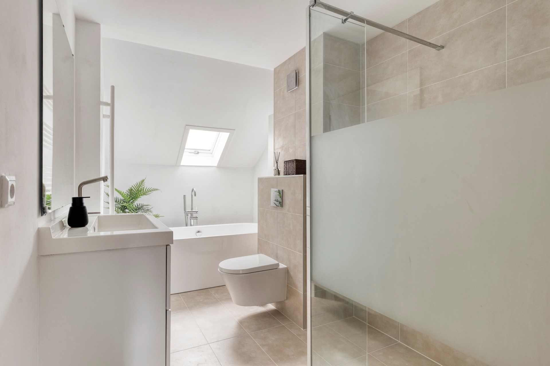 1e Verdieping: Overloop, 3 slaapkamers van respectievelijk 10, 12 en 15 m². Lichte badkamer waarbij recentelijk het tegelwerk is vernieuwd, ligbad en aparte inloopdouche, 2e toilet, wastafelmeubel en designradiator. Ook deze verdieping is voorzien van een laminaatvloer.