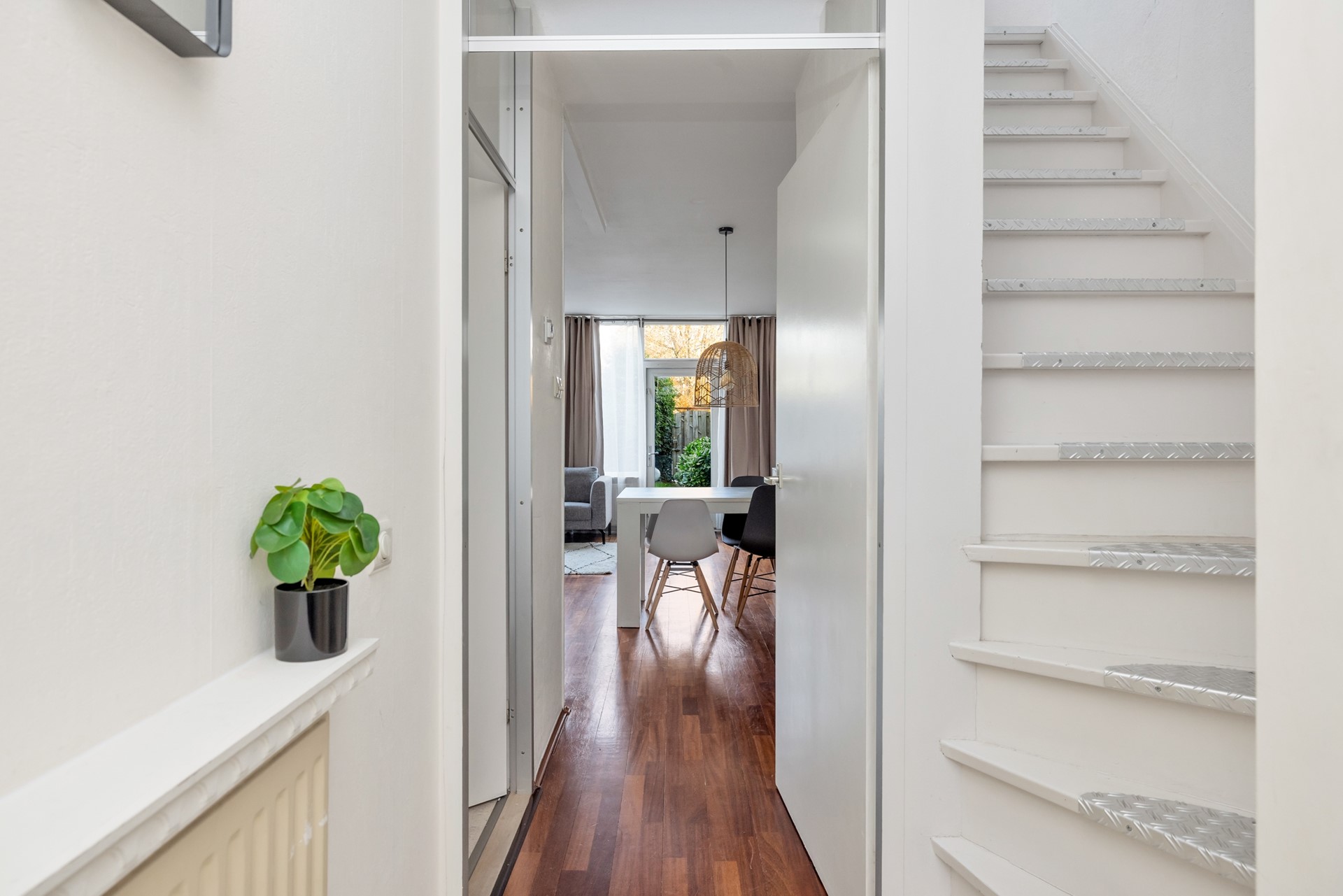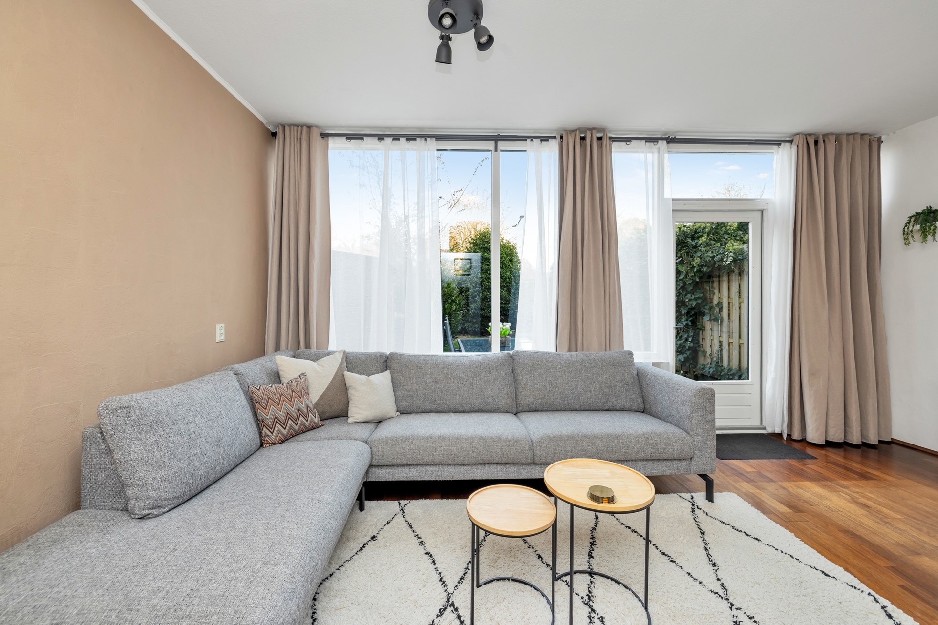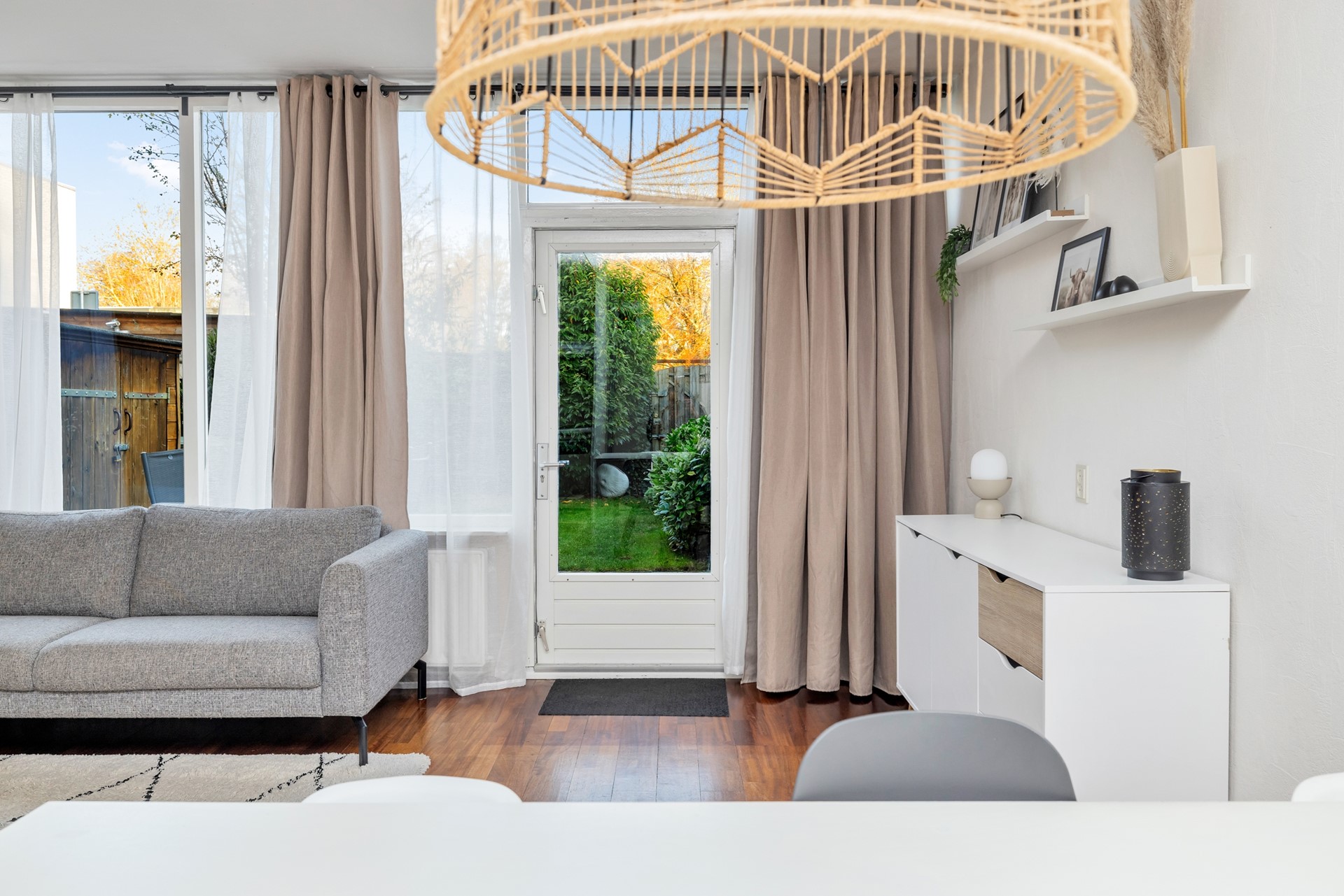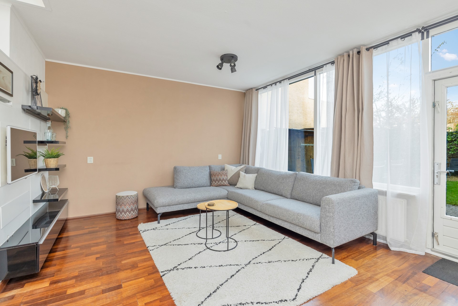 Daarna stap je de lichte woonkamer in. Dankzij de grote glazen pui met achterdeur sta je zo in de tuin. De sfeervolle houten vloer geeft de ruimte een warme uitstraling.