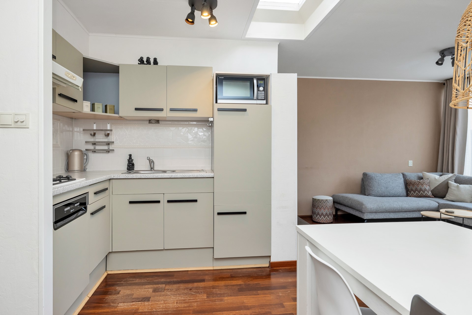 De open, moderne keuken is extra licht door de dakkoepel en voorzien van een koel-vriescombinatie, combi magnetron, vaatwasser, gaskookplaat en afzuigkap. De trapkast biedt praktische opbergruimte.