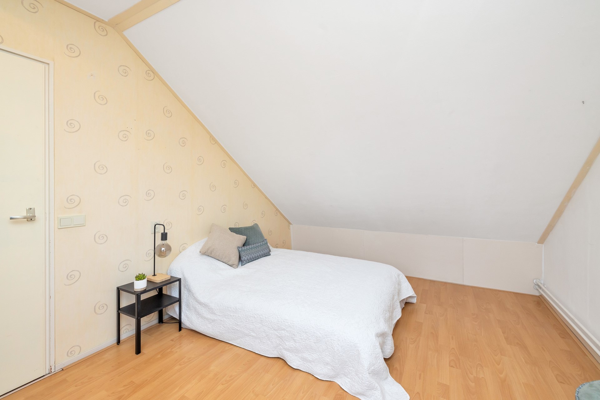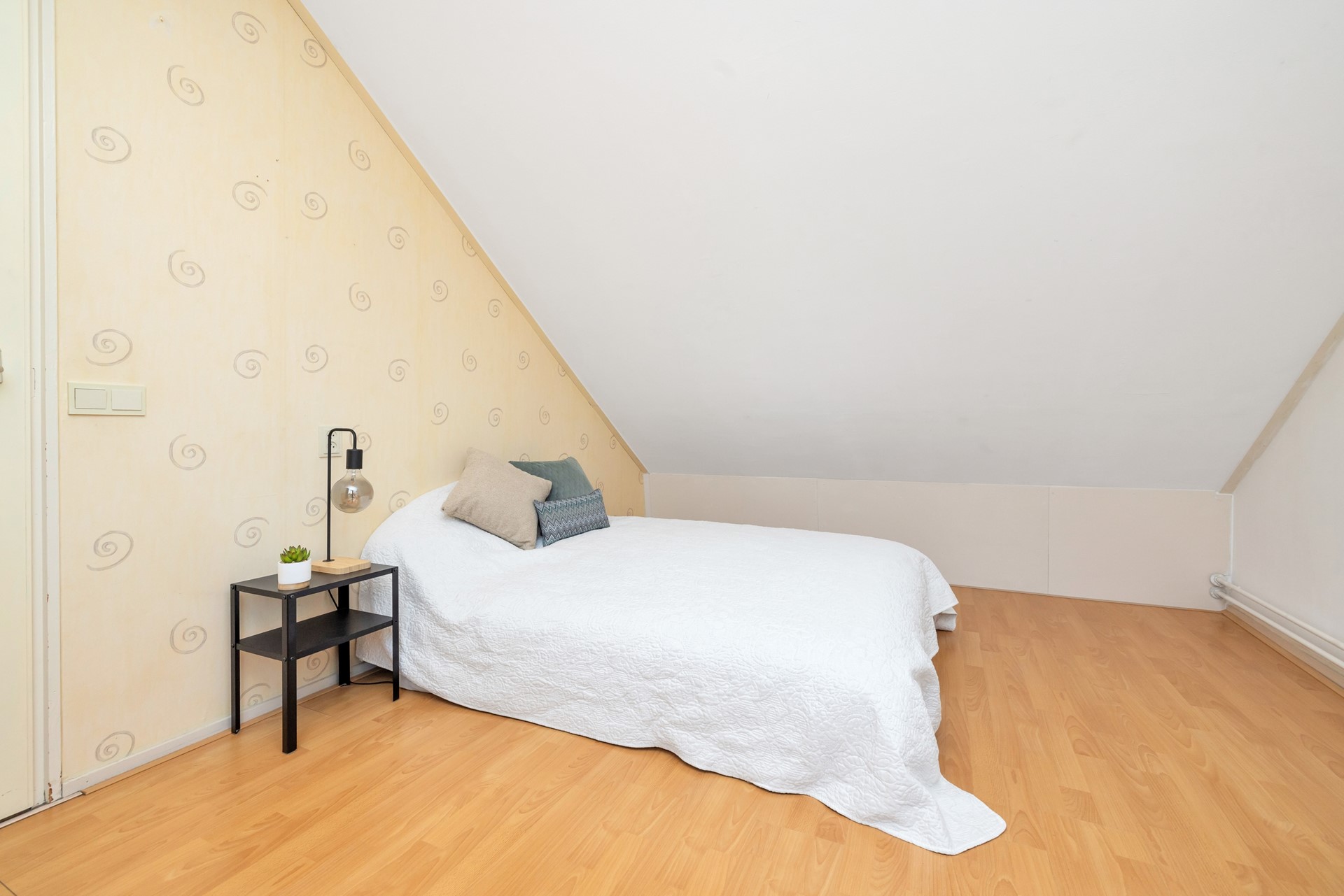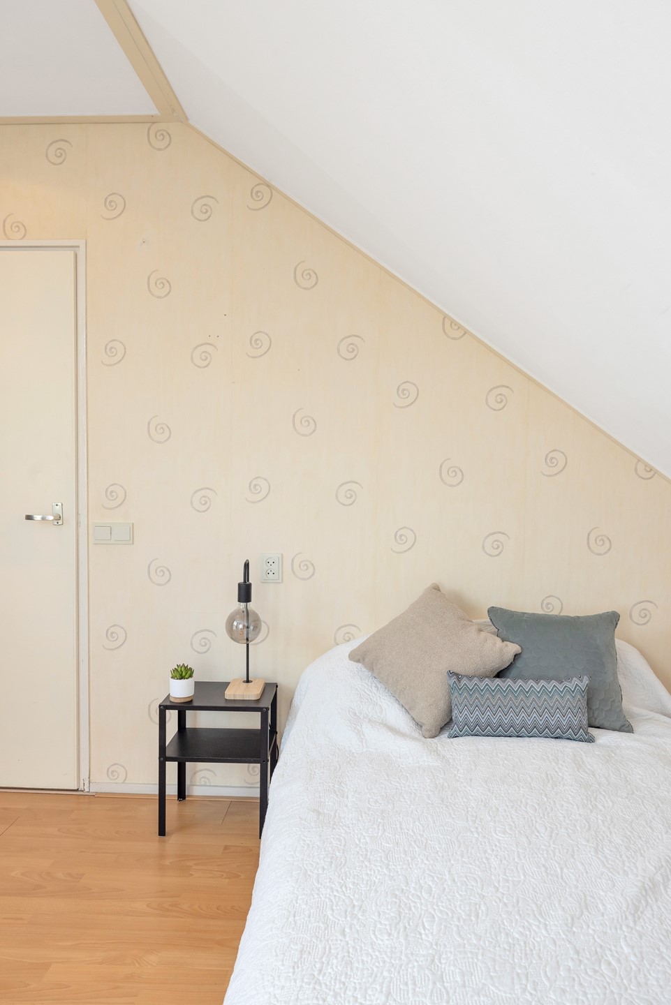 De overloop en ruime slaapkamer hebben grote ramen die zorgen voor een prachtig vrij uitzicht over het groen. De verdieping beschikt over extra bergruimte en is afgewerkt met laminaat. Hier vind je ook de Nefit cv-ketel (2025).
