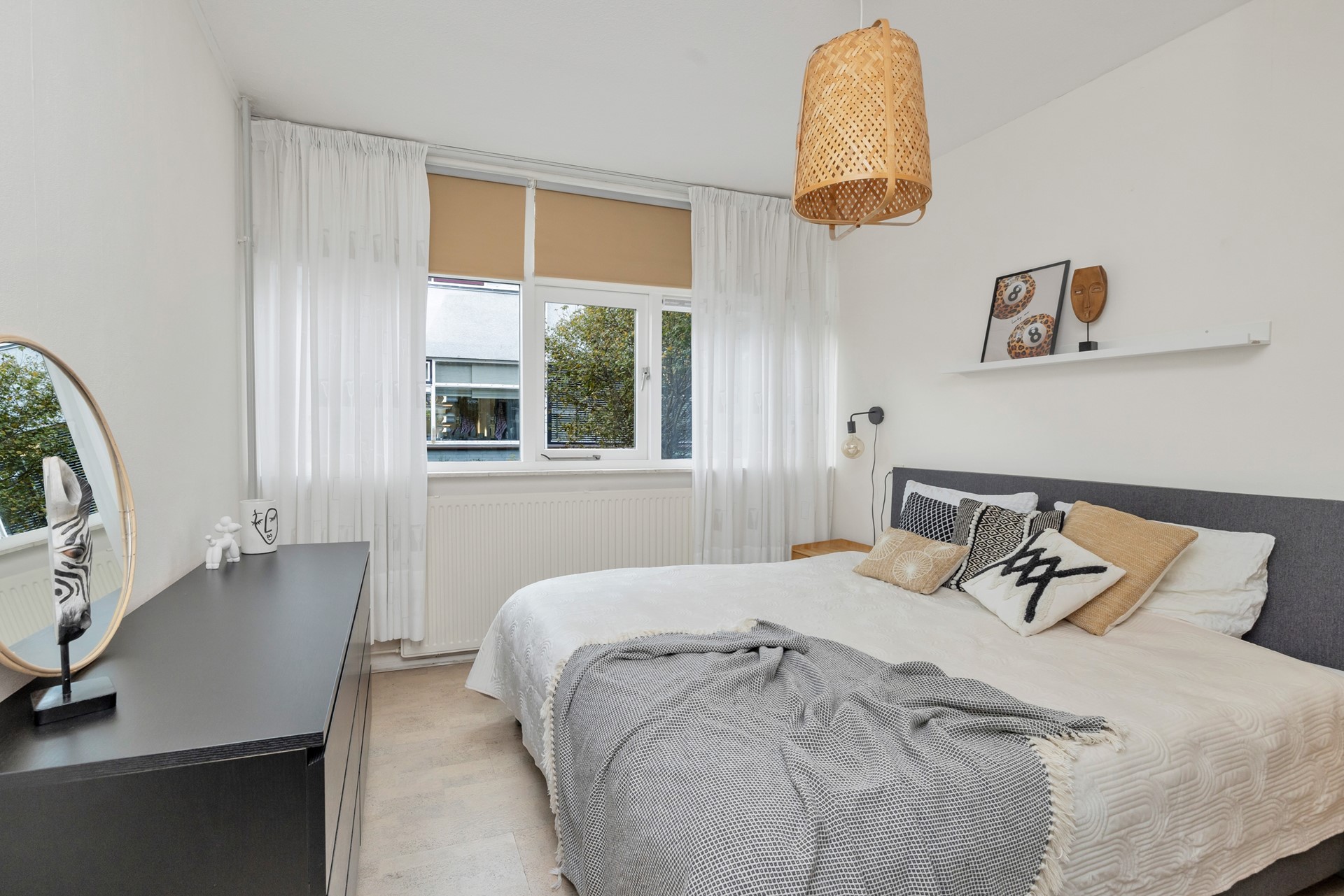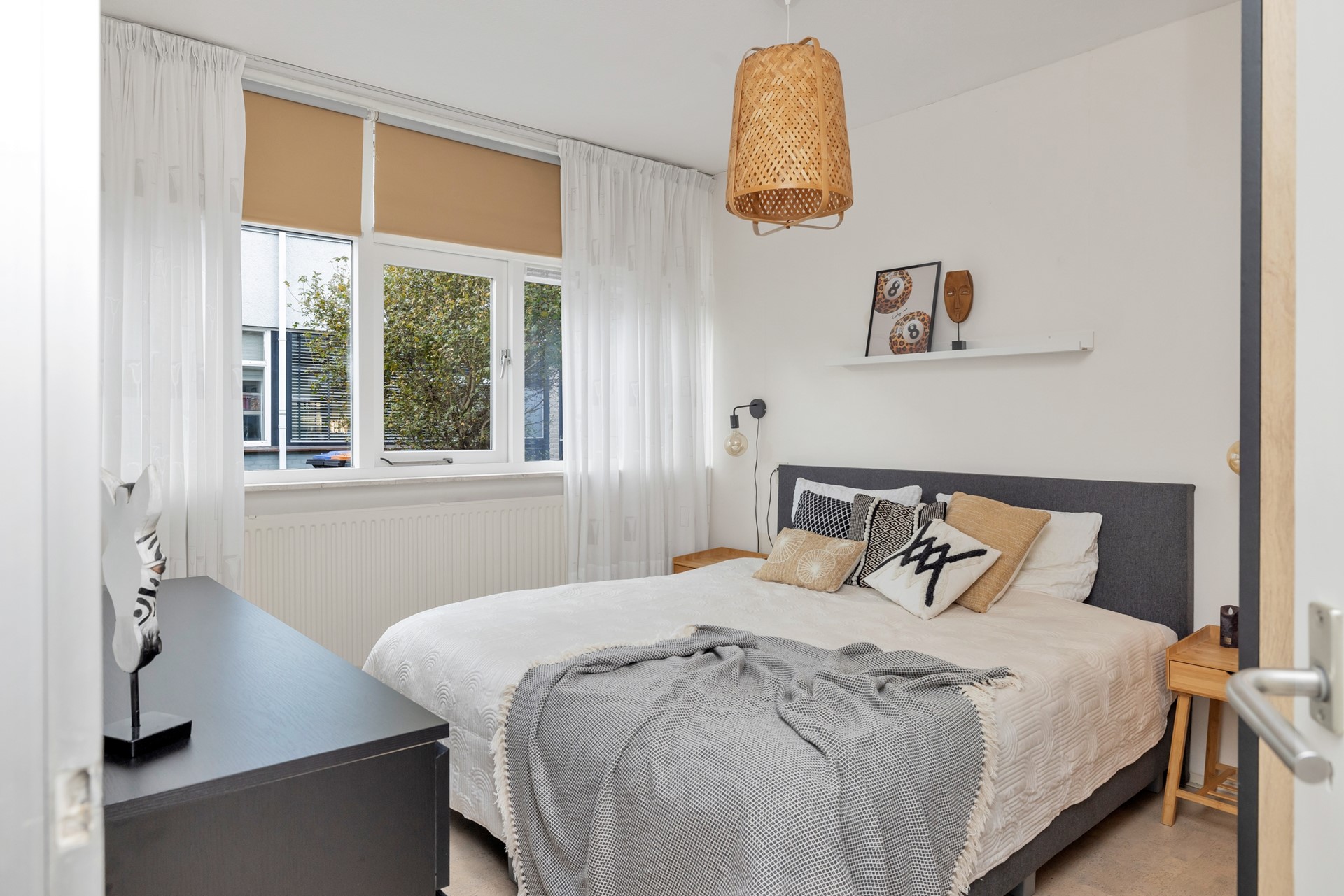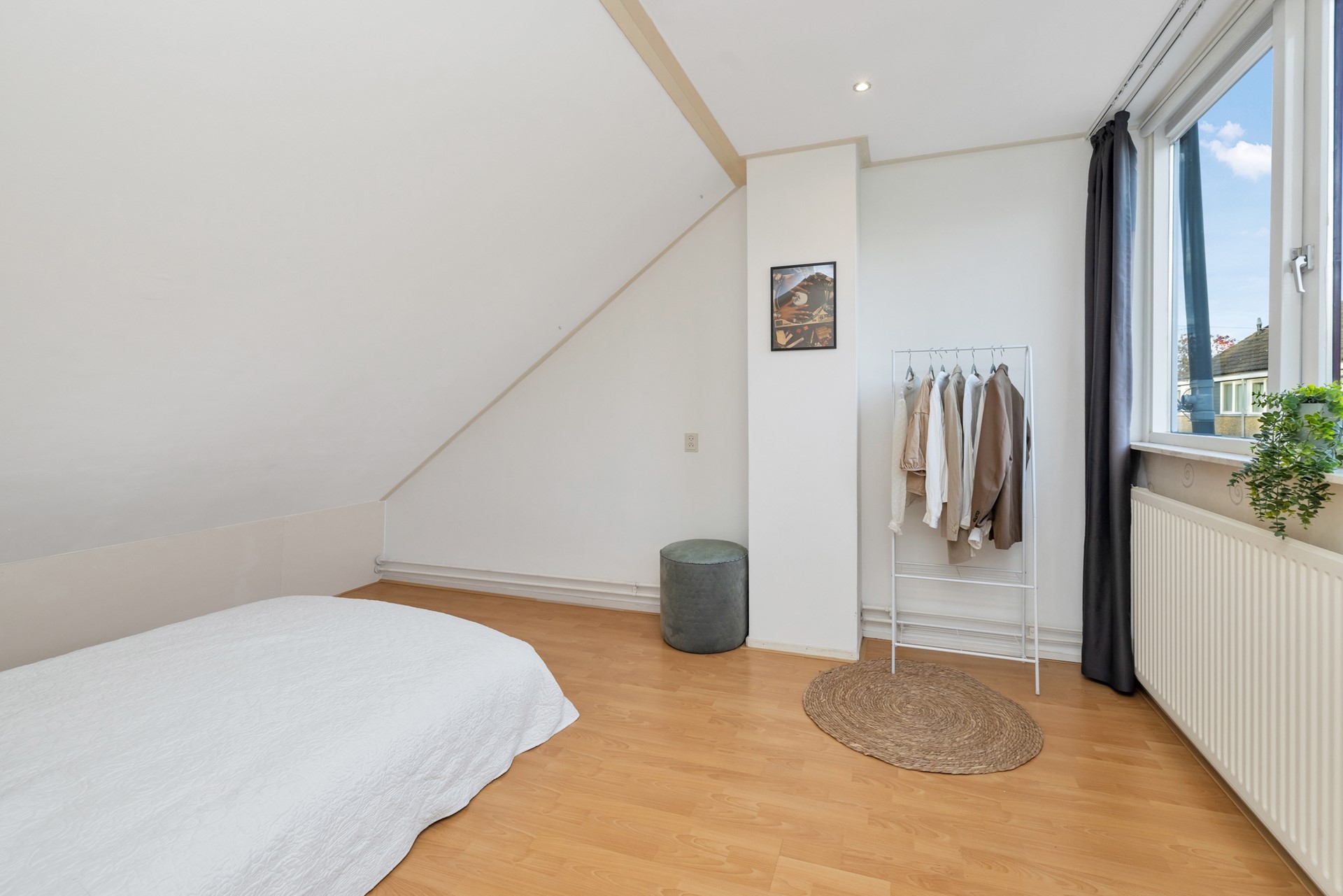 De overloop en ruime slaapkamer hebben grote ramen die zorgen voor een prachtig vrij uitzicht over het groen. De verdieping beschikt over extra bergruimte en is afgewerkt met laminaat. Hier vind je ook de Nefit cv-ketel (2025).