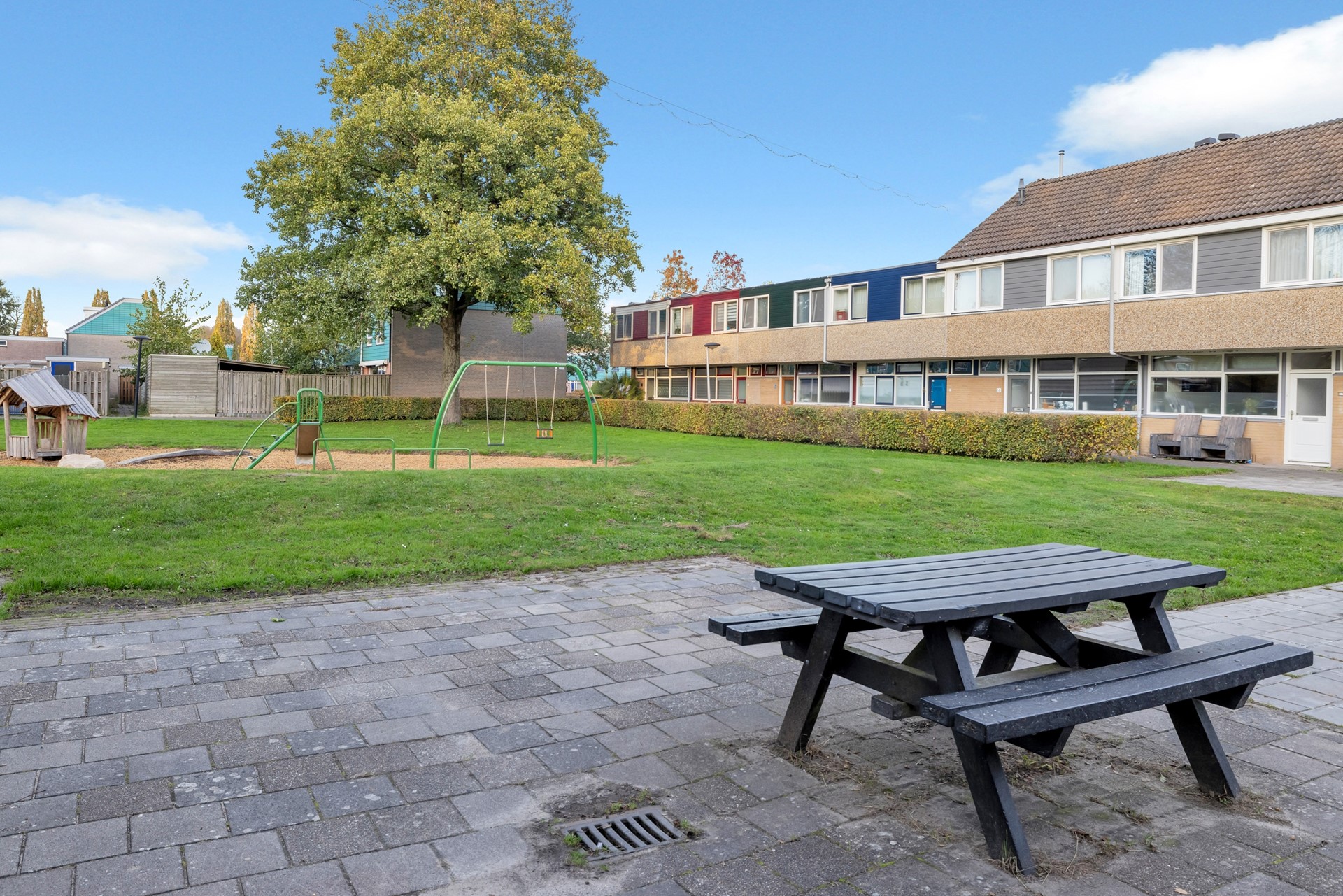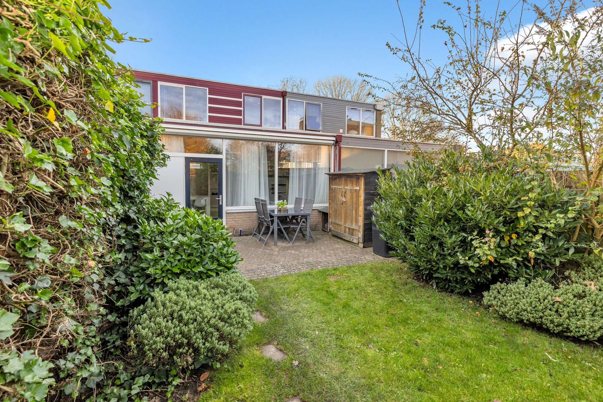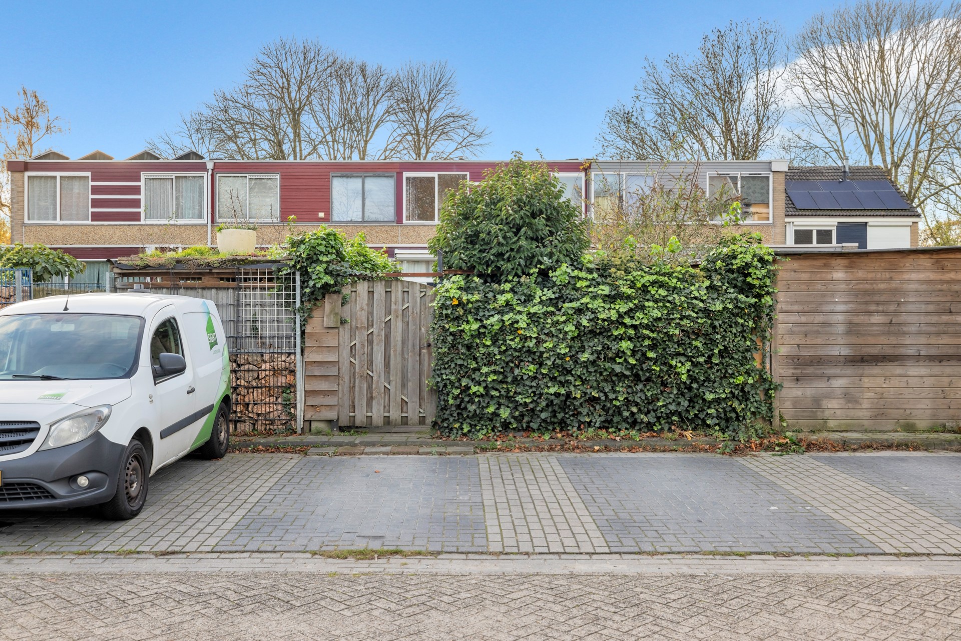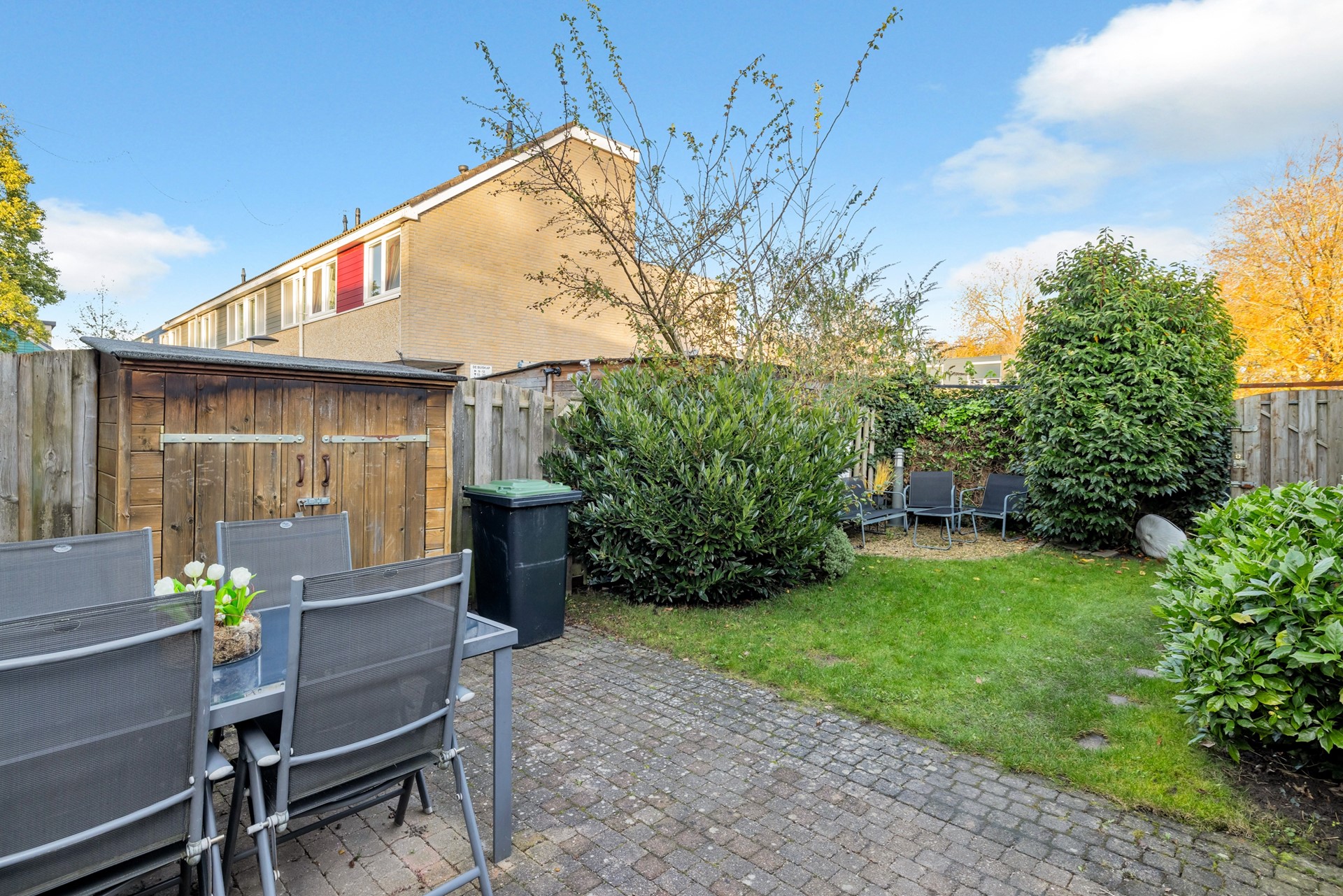 Aan de voorzijde ligt een onderhoudsvriendelijke voortuin met stenen berging. De achtertuin ligt vrij op het oosten en grenst aan een openbare parkeerplaats, waardoor je geniet van optimale privacy. De tuin is ingericht met straatwerk, beplanting en een houten berging voor extra opslag.