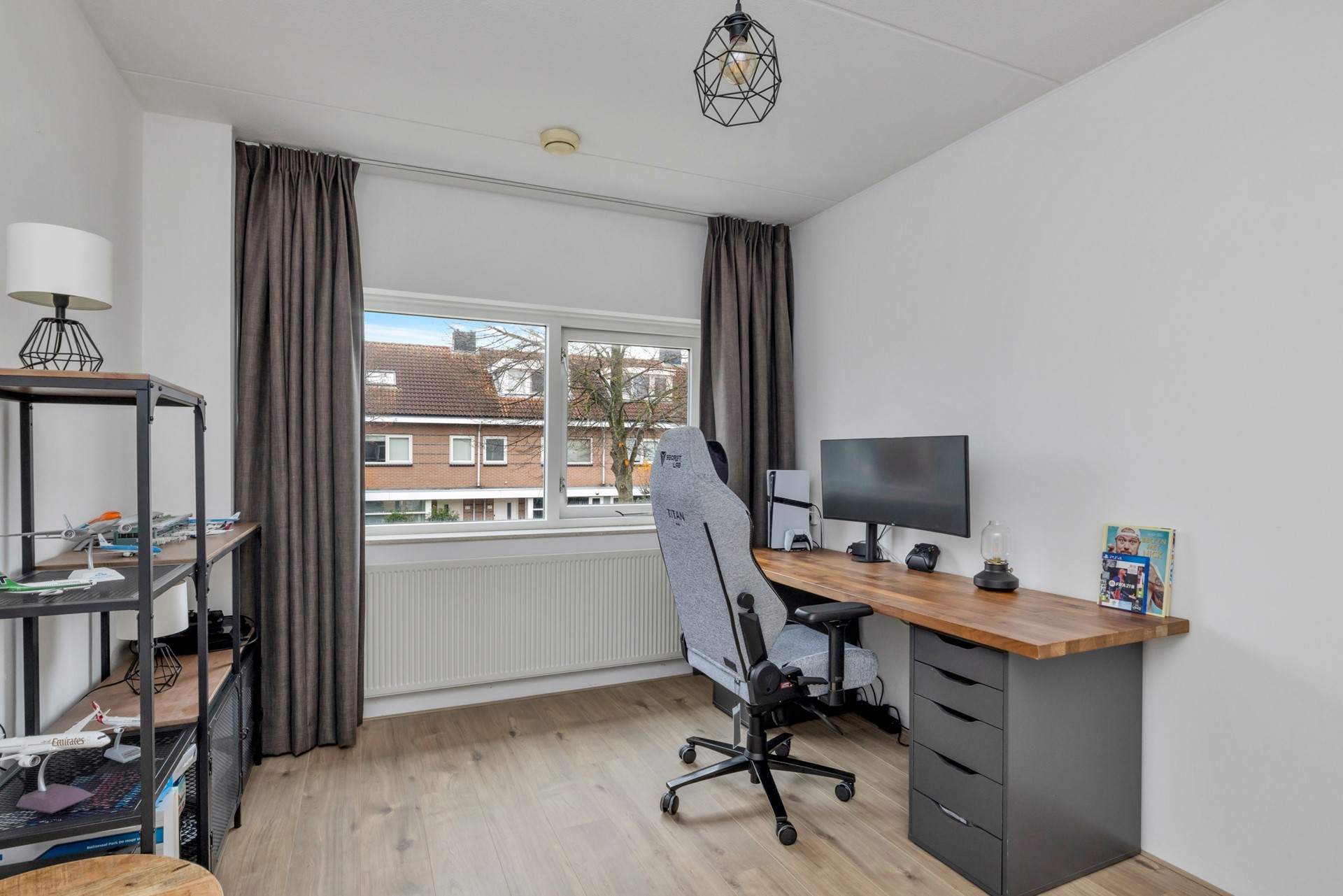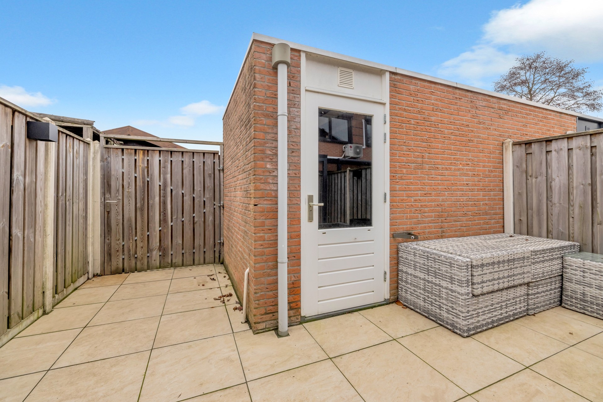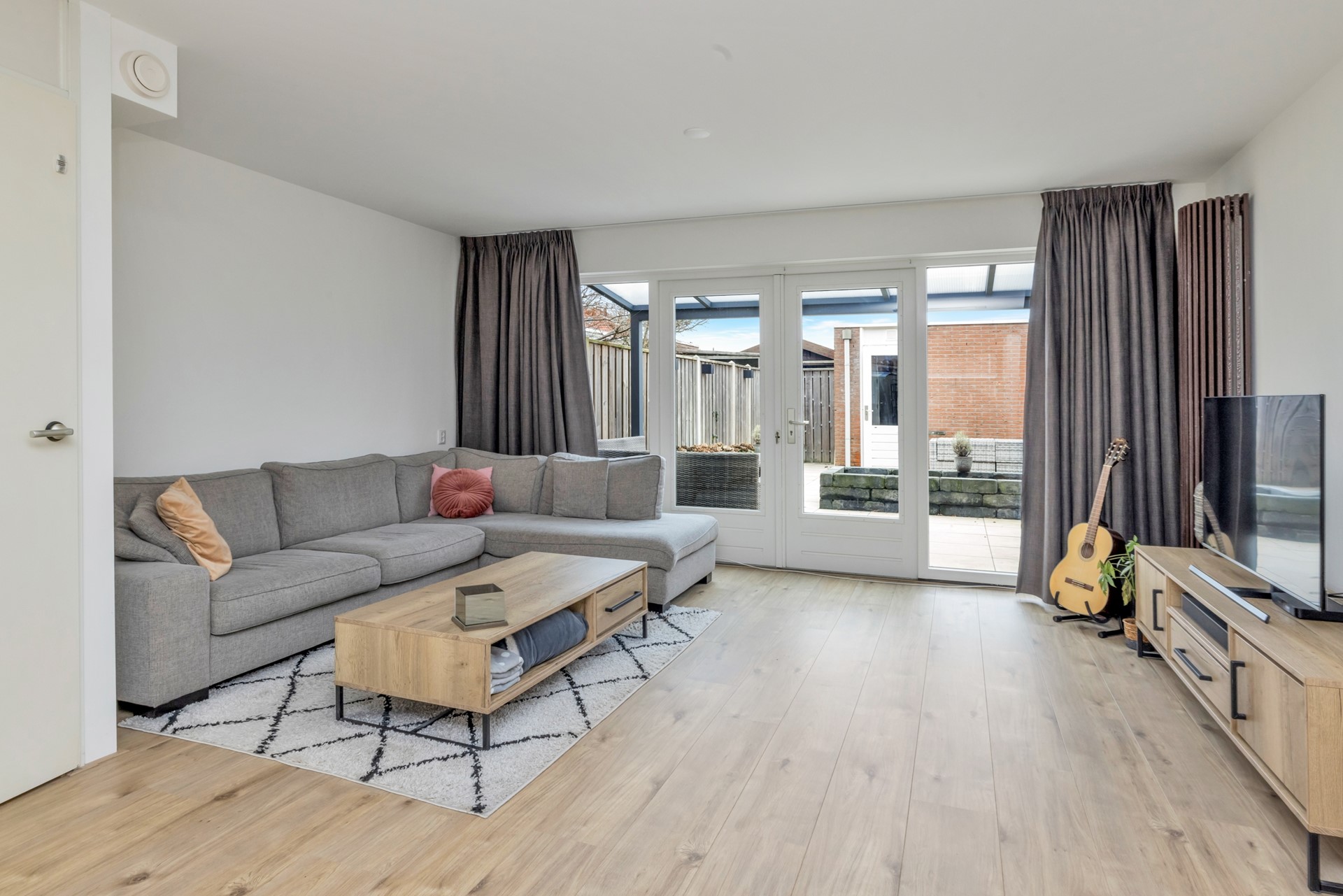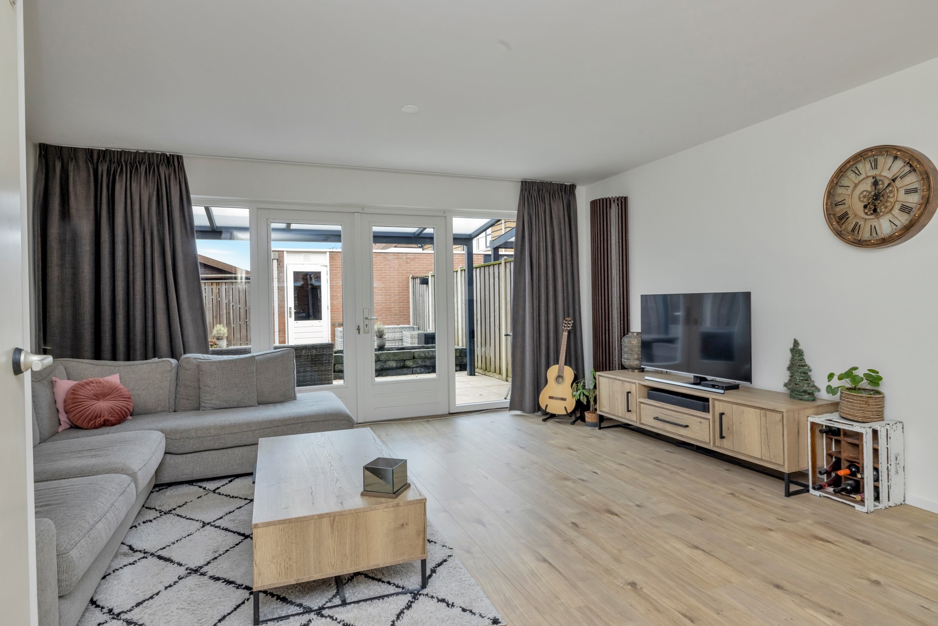 De ruime, tuingerichte woonkamer is afgewerkt met een laminaatvloer en strak gestuukte wanden. Onder de trap bevindt zich een praktische vaste bergkast. Via openslaande deuren is er toegang tot de fraai aangelegde tuin met moderne serre, waar u optimaal van het buitenleven kunt genieten. Tevens is er een vrijstaande stenen berging en een achterom naar de privéparkeerplaats.