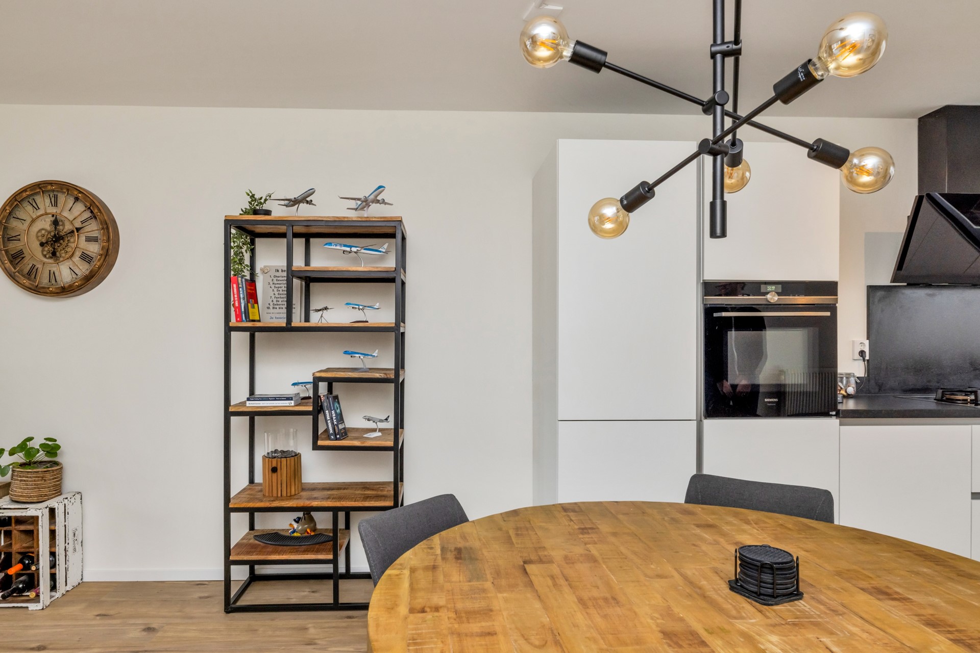 Overdekte entree, hal met meterkast en luxe toiletruimte met hangcloset en fonteintje. De moderne, straatgerichte keuken is compleet uitgerust met een ingebouwde koelkast en vriezer, combimagnetron, 5-pits gaskookplaat, moderne afzuigschouw en vaatwasser.