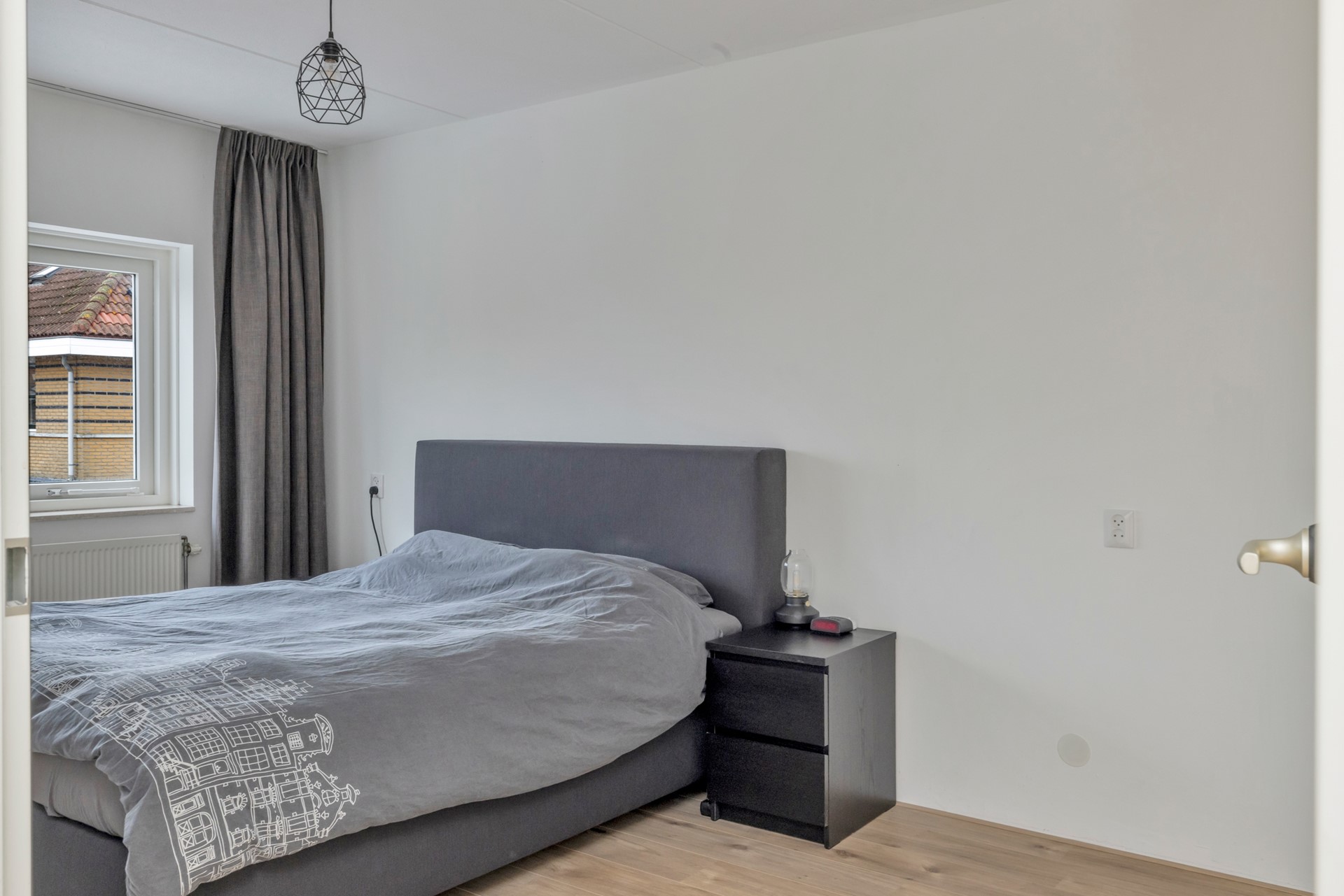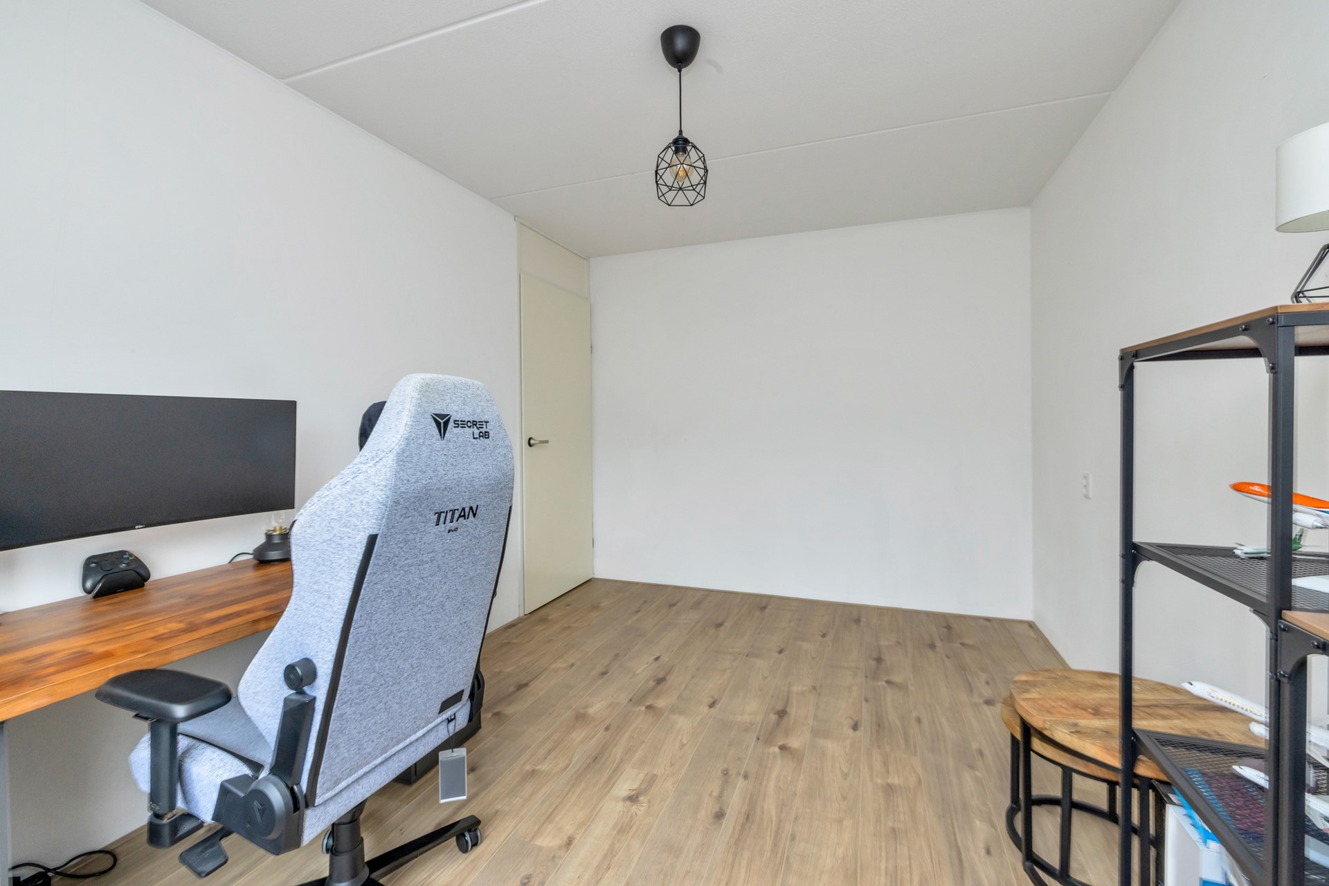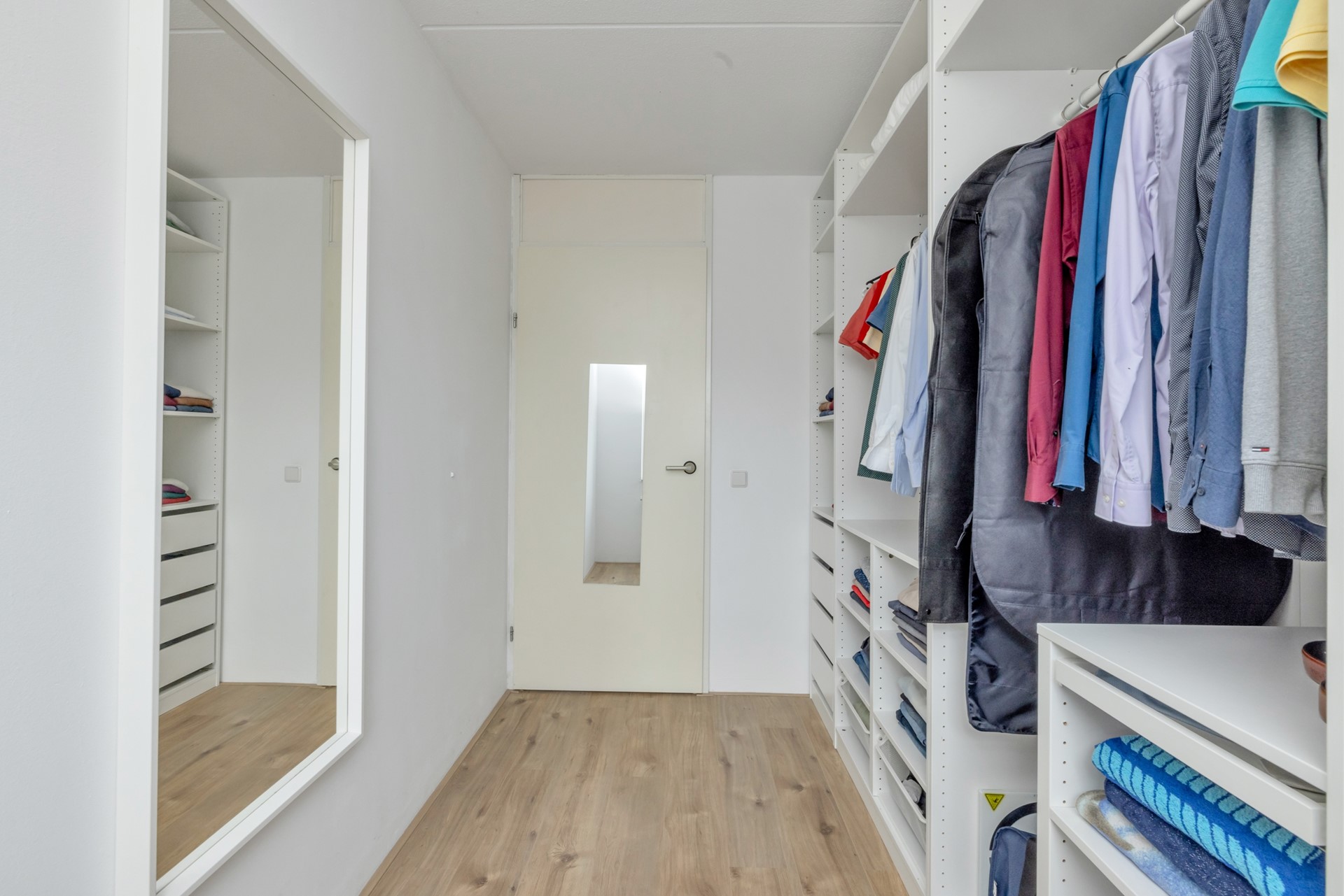 Overloop met toegang tot drie slaapkamers, allen voorzien van strak gestuukte wanden en een laminaatvloer. Eén slaapkamer beschikt over een stijlvolle kastenwand en wordt momenteel gebruikt als walk-in closet. De luxe badkamer is ingericht met een wastafelmeubel, ligbad, tweede hangcloset en een douche met cabine.