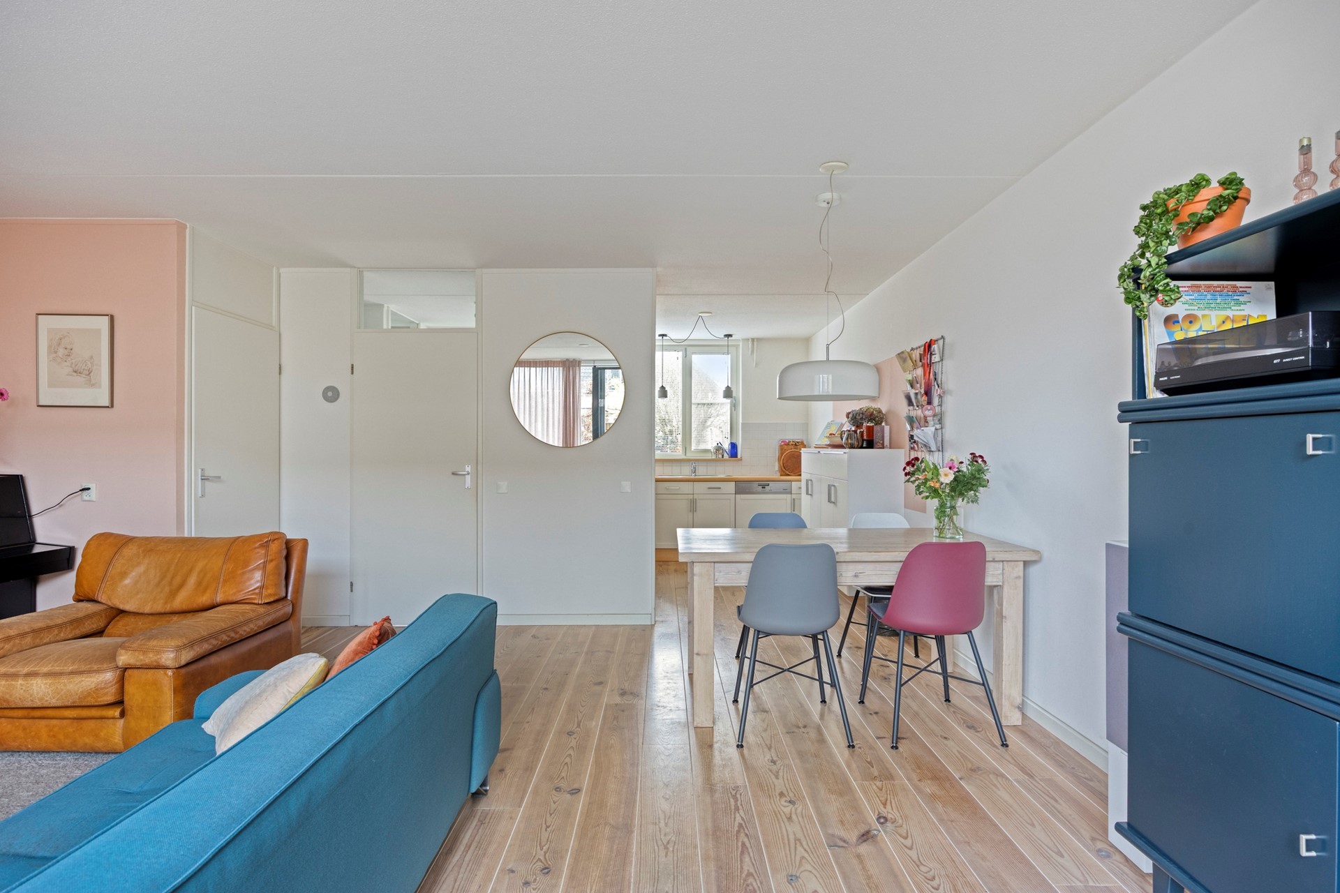 Entree, hal, meterkast, toilet, tuingerichte woonkamer met schuifpui, de vloer heeft een massieve 22 millimeter grenen vloer. De woning is in 2021 in zijn geheel voorzien van aluminium kozijnen met HR++ glas en horren. De keuken is voorzien van alle gemakken zoals een vaatwasser, afzuigkap, oven en een 4-pits gasfornuis.