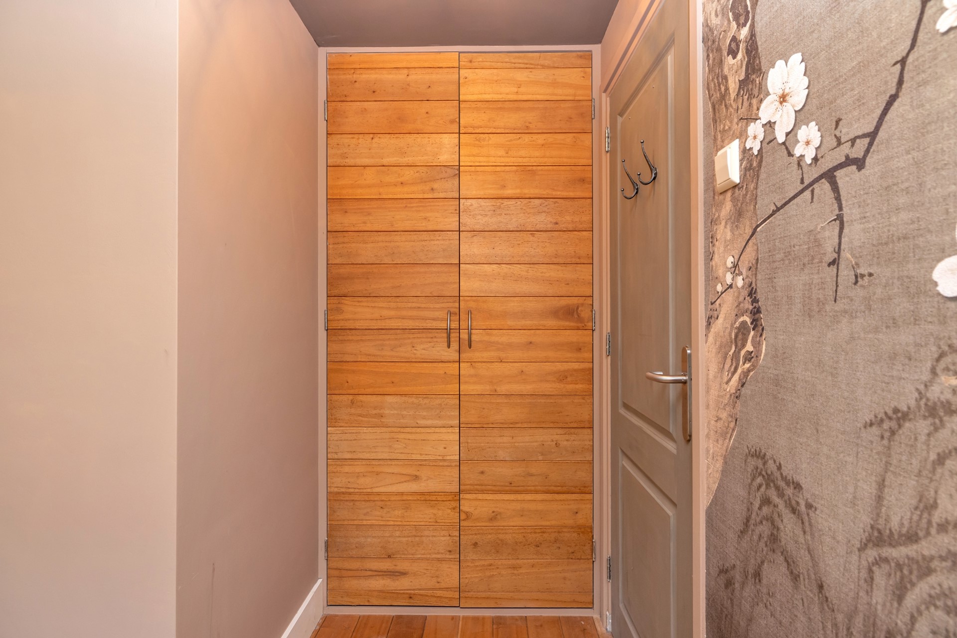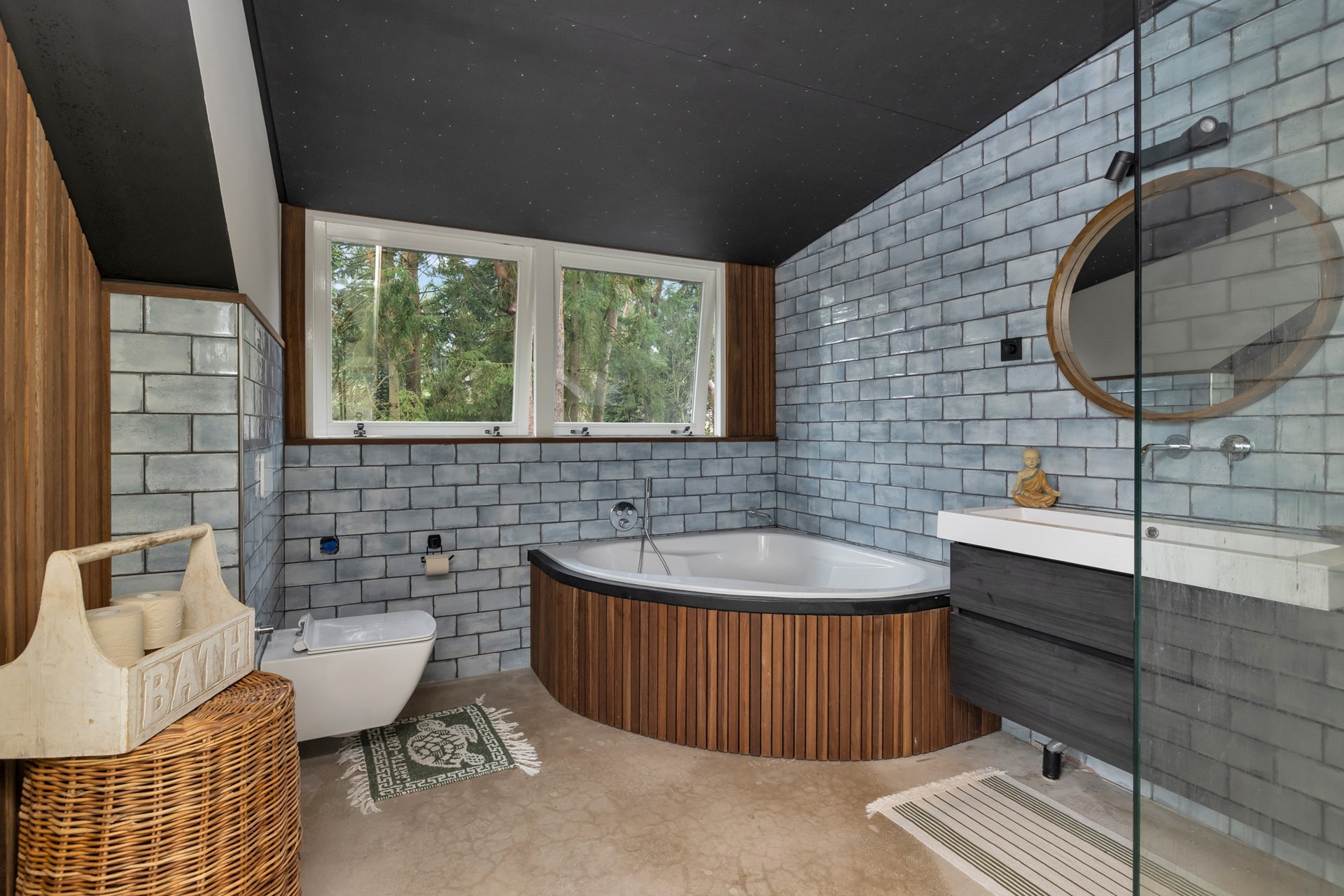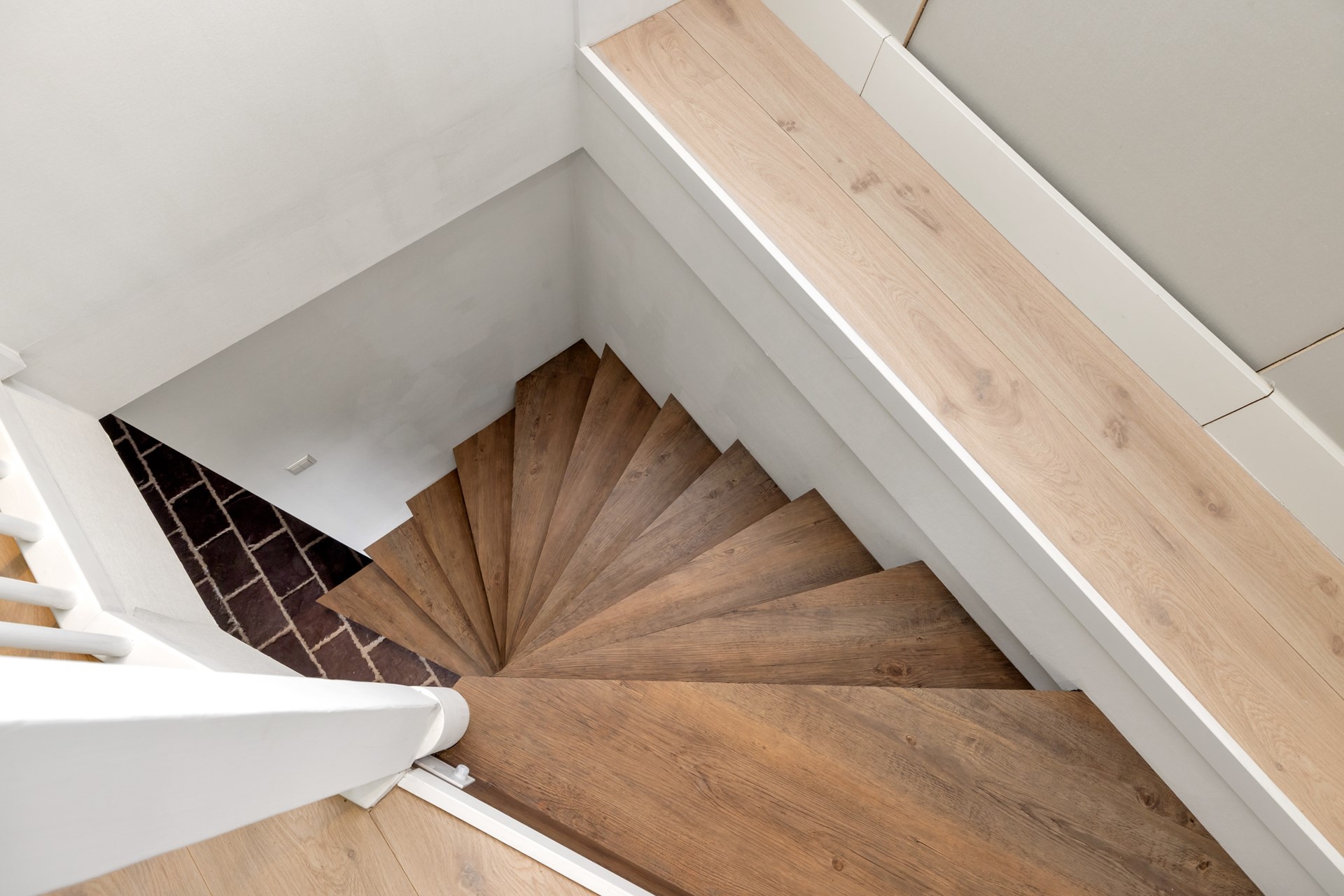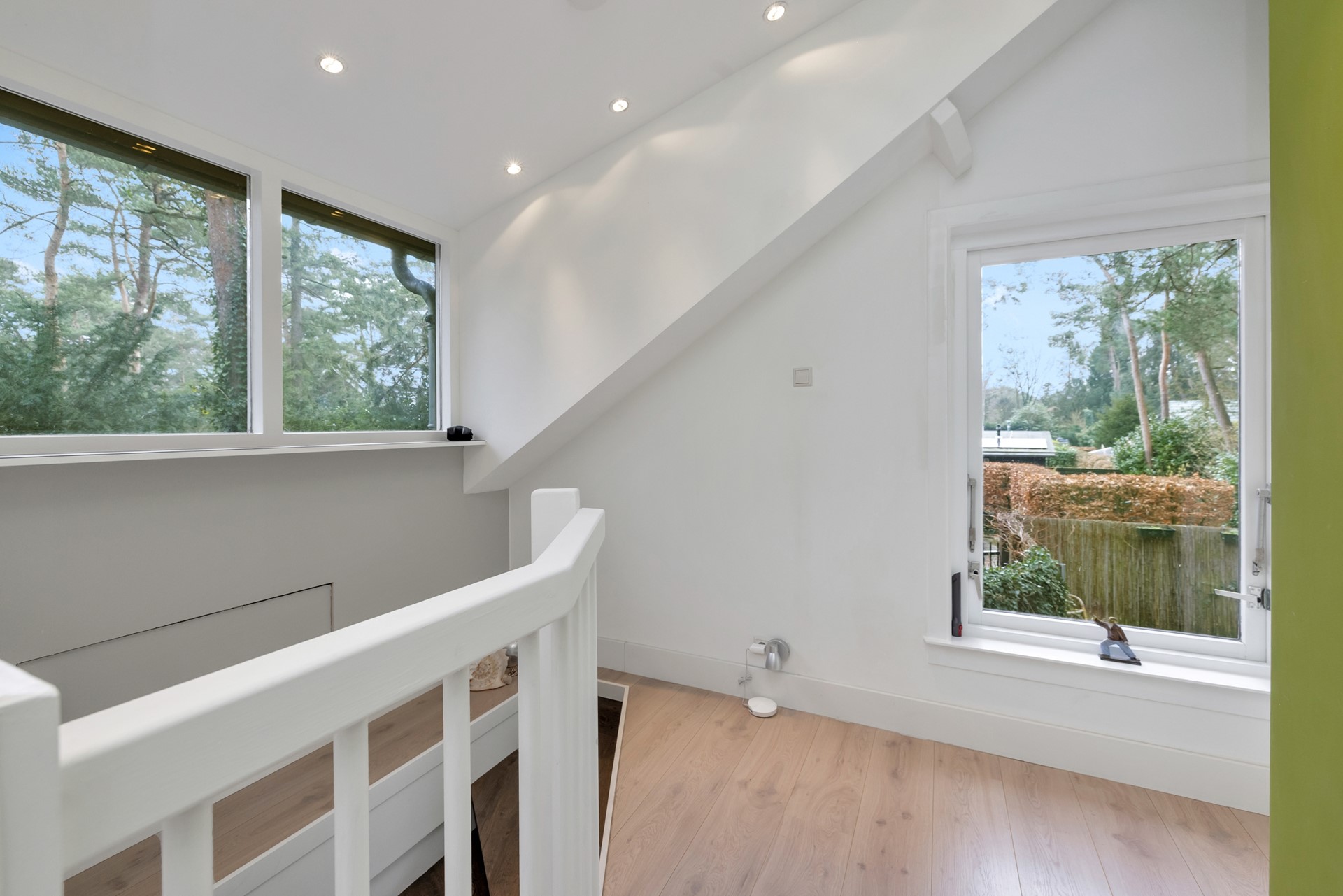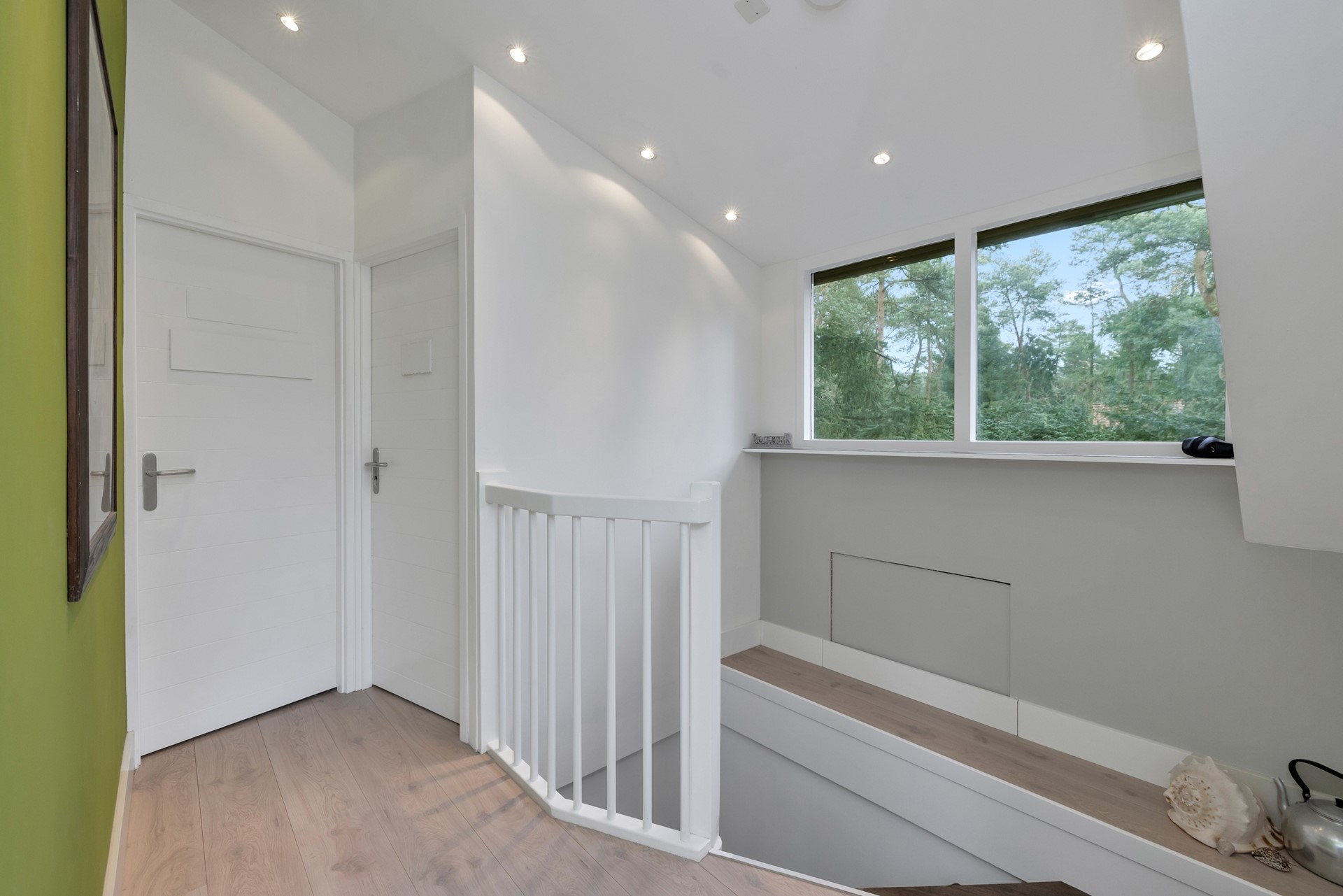 Eerste verdieping Royale overloop met toegang tot twee ruime slaapkamers. Moderne badkamer in lichtblauw met donkere houten accenten en gietvloer. Uitgerust met ligbad, inloopdouche, wastafelmeubel en hangtoilet.